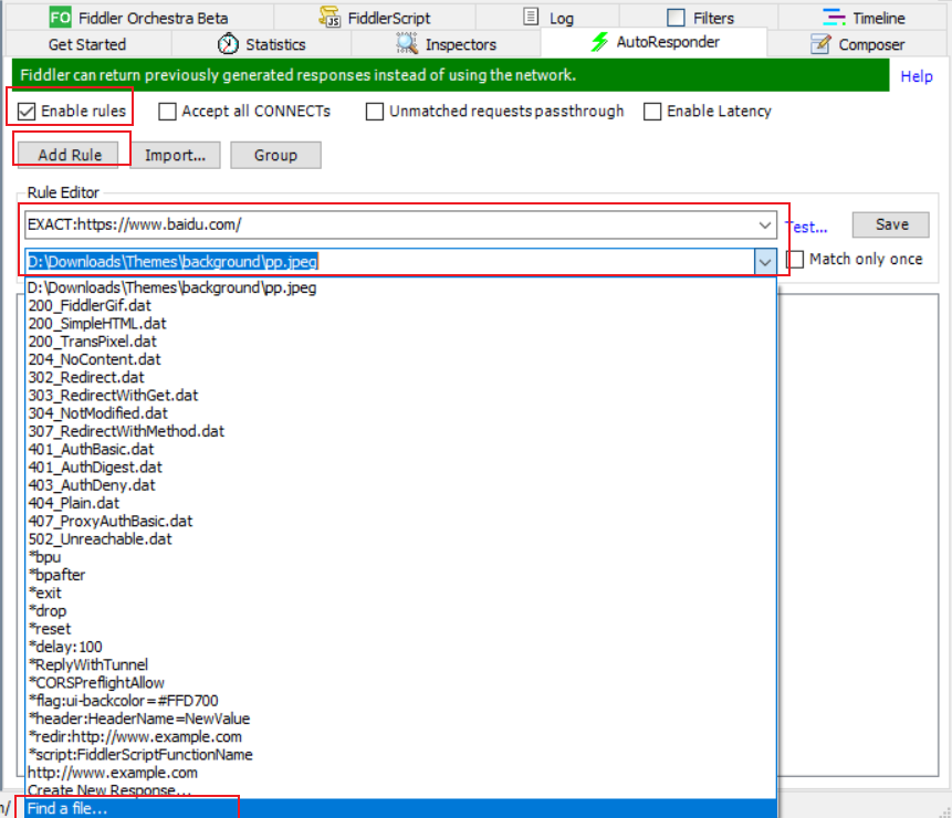 AutoResponse页签:它可以抓取在线页面保存到本地进行调试,大大减少了在线调试的困难,可以让我们修改服务器端返回的数据,例如让返回都是404的数据包读取本地文件作为返回内容。