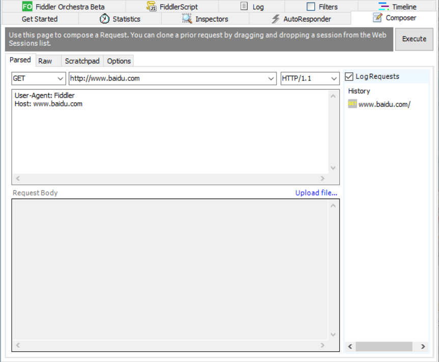composer页签:支持手动构建和发送HTTP,HTTPS和FTP请求,我们还可以从回话列表中拖曳回话,把它放到composer选项卡中,当我们点击Execute按钮时则把请求发送到服务器端。