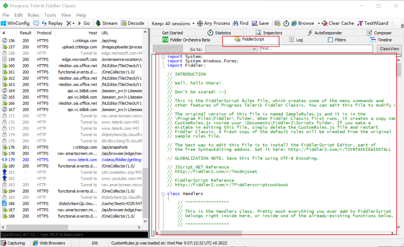FiddlerScripts页签:打开Fiddler脚本编辑。