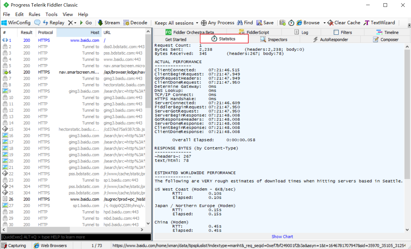 Statistics页签:通过该页签,用户可以通过选择多个会话来得到这几个会话的总的信息统计,比如多个请求传输的字节数。访问页面时选择第一个请求和最后一个请求,可获得整个页面加载所消耗的总体时间。从条形图表中还可以分别出哪些请求耗时最多,从而对页面的访问进行速度性能优化。