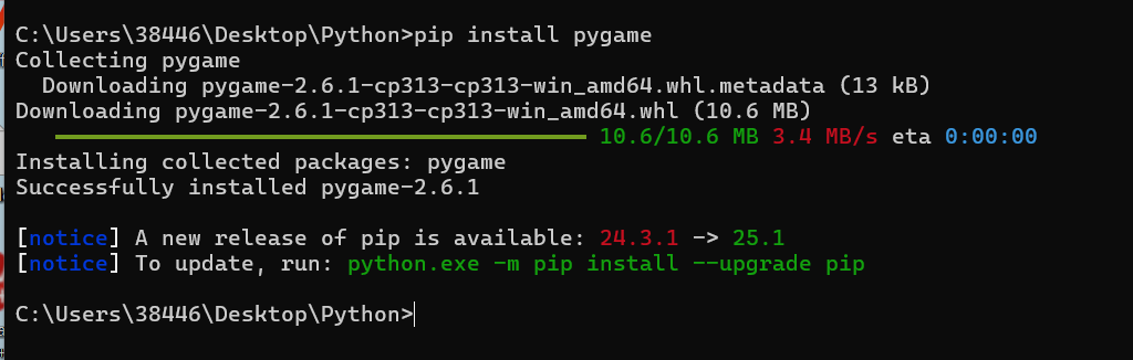 线:pygame.draw.line(surface, color, start_pos(开始位置), end_pos(结束位置), width=1(线条像素宽度))