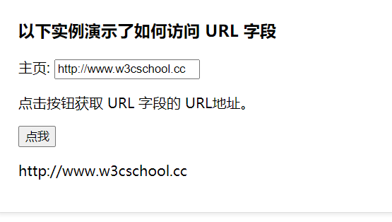 <!DOCTYPE html> <html> <head> <meta charset="utf-8"> <title>菜鸟教程(runoob.com)</title> </head> <body> <h3>以下实例演示了如何访问 URL 字段</h3> 主页: <input type="url" id="myURL" value="http://www.w3cschool.cc"> <p>点击按钮获取 URL 字段的 URL地址。</p> <button onclick="myFunction()">点我</button> <p id="demo"></p> <script> function myFunction() { var x = document.getElementById("myURL").value; document.getElementById("demo").innerHTML = x; } </script> </body> </html>