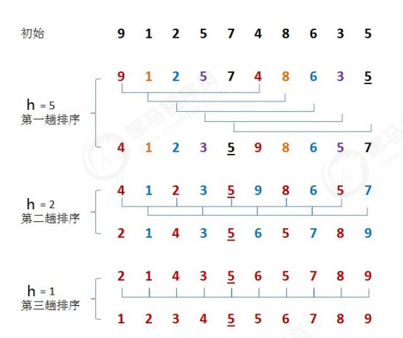 希尔排序是插入排序的一种,又称“缩小增量排序”,是插入排序算法的一种更高效的改进版本。