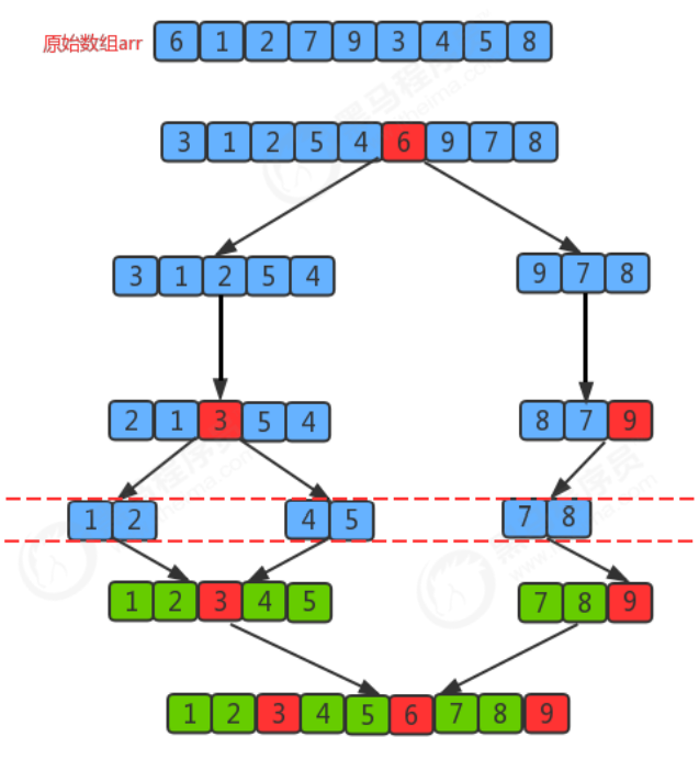 1.首先设定一个分界值,通过该分界值将数组分成左右两部分;