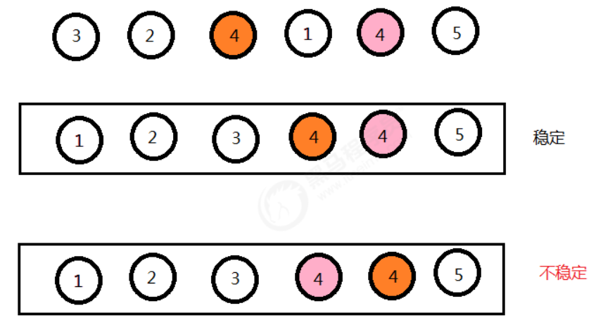 数组arr中有若干元素,其中A元素和B元素相等,并且A元素在B元素前面,如果使用某种排序算法排序后,能够保 证A元素依然在B元素的前面,可以说这个该算法是稳定的。