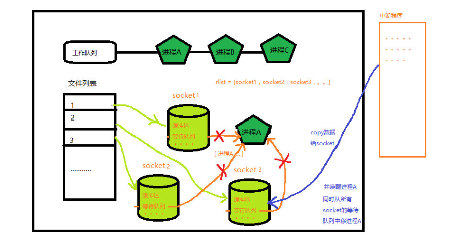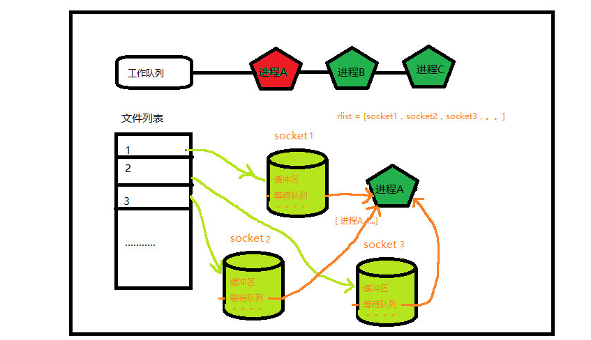 2.遍历这个列表将进程A 添加到每个socket的等待队列中 然后阻塞进程