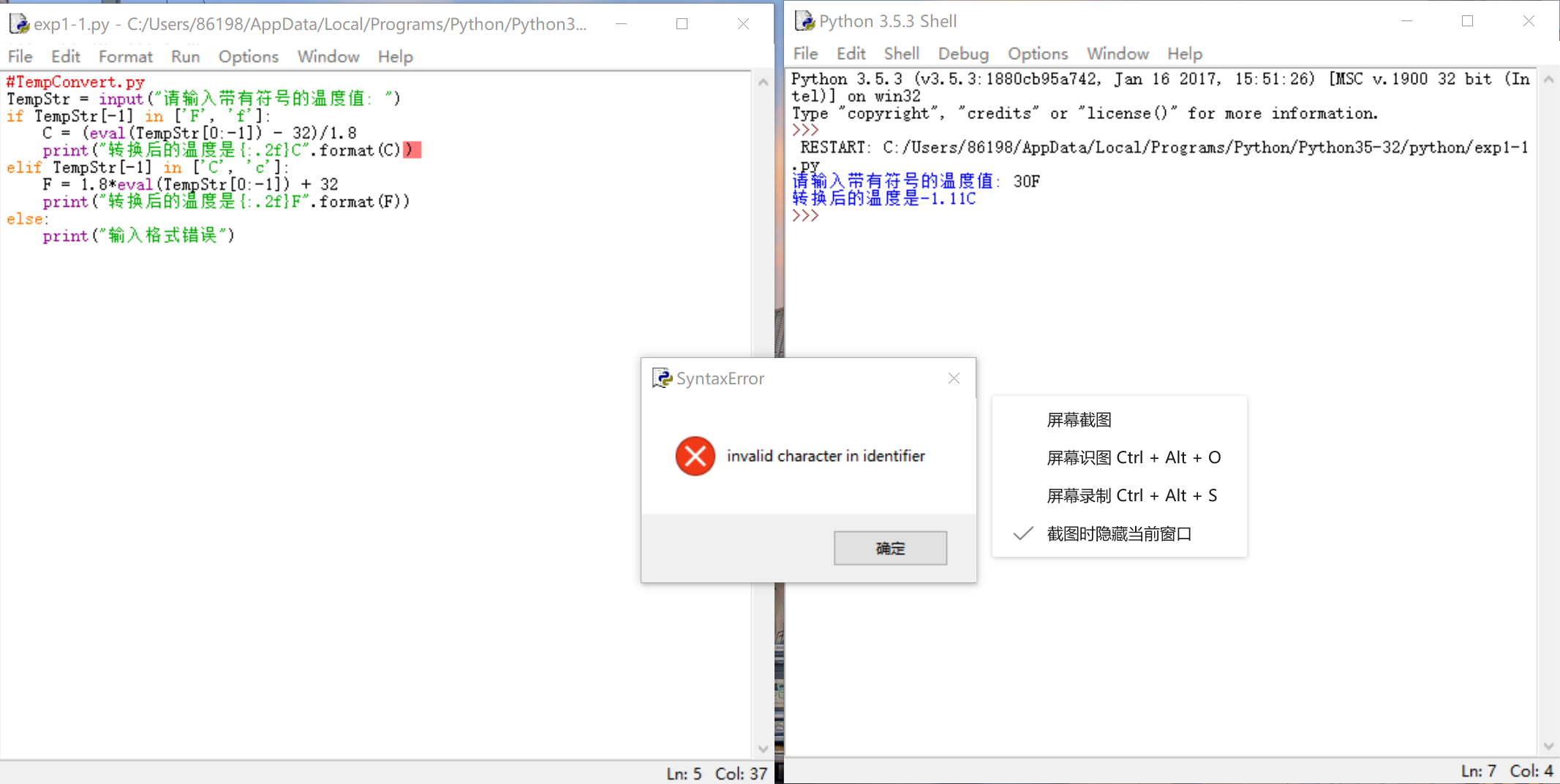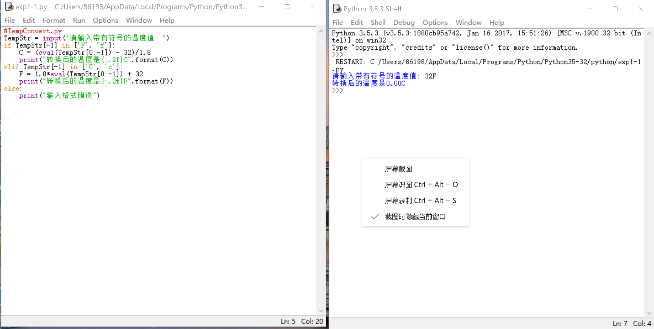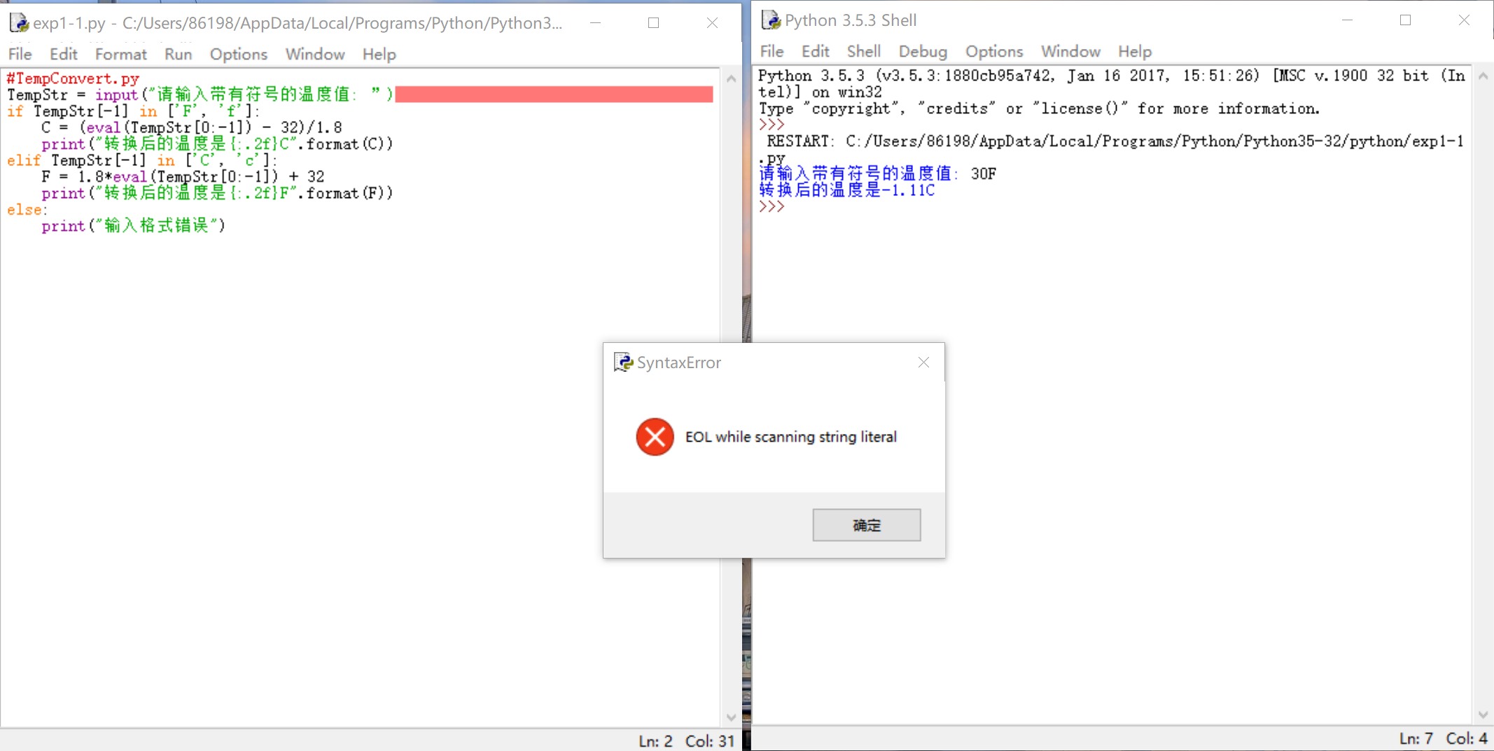 2行第一章课本的温度转换示例程序。在运行过程中