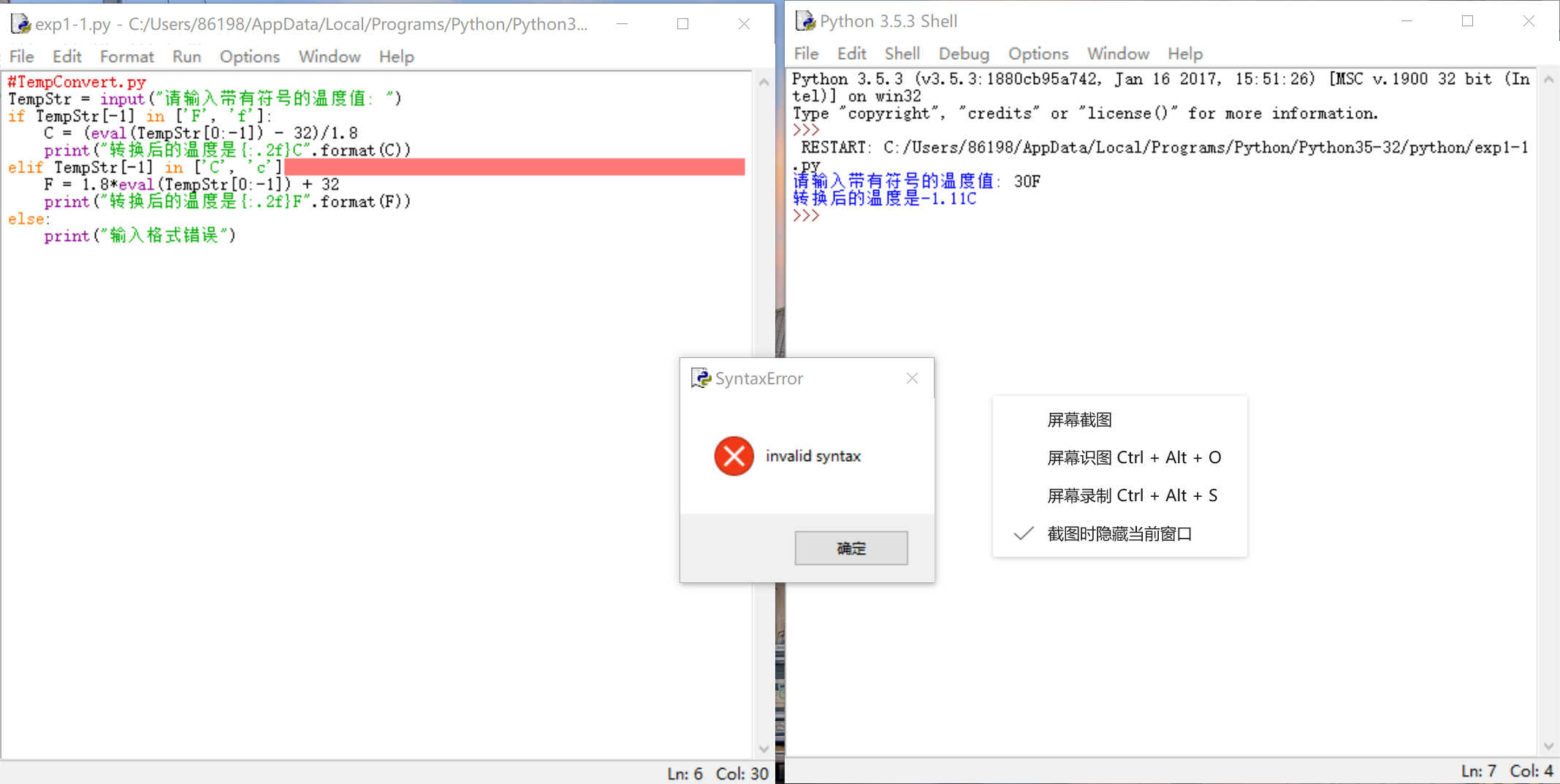 1、按照实验指导安装IDLE,尝试交互式运行python程序和批量运行python程序二种方式。