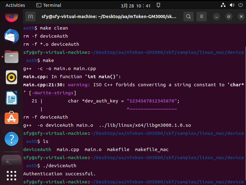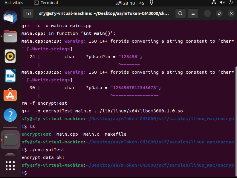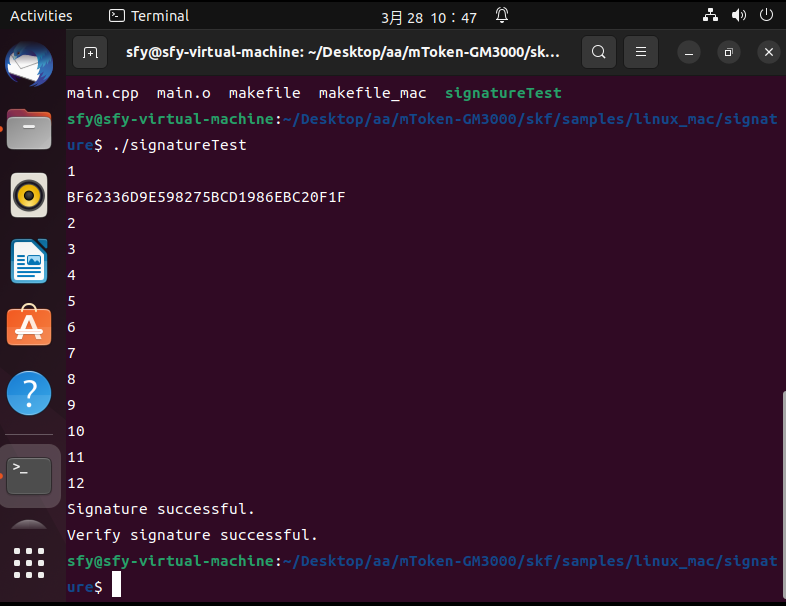 2 在Ubuntu中运行 “龙脉密码钥匙驱动实例工具等\mToken-GM3000\skf\samples\linux_mac”中例程,提交运行结果截图