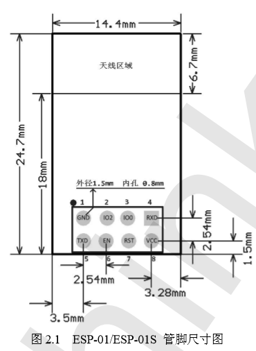 本次我想要实现的功能是获取网络时间供MCU使用,所以选择结构简单的一款封装——ESP01S,ESP01S的具体参数如下(图源:安信可ESP8266开发手册)