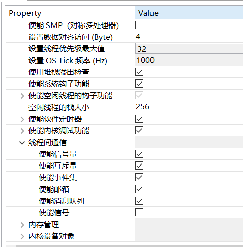 可以看到,线程间通信一栏,这就是RTT给开发者提供的通信机制,在实际开发中,这些机制可以满足绝大部分需求。RTT系统默认打开了信号量,互斥量,事件集,邮箱,消息队列五种机制。