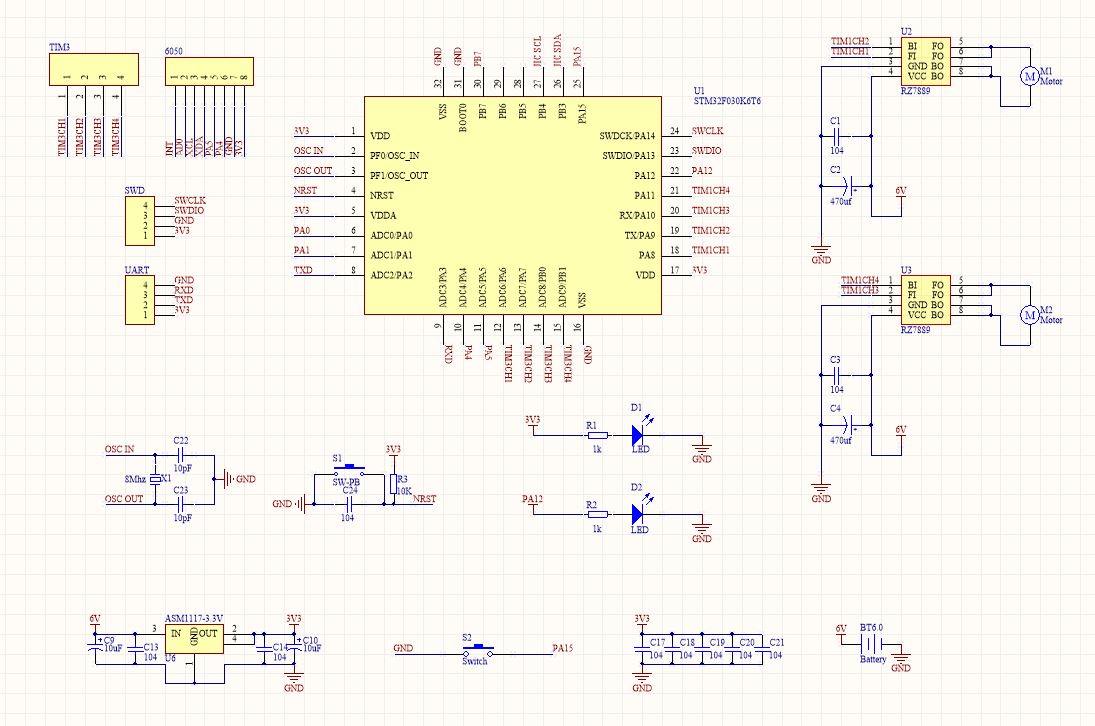 主要系统通过这几个硬件元素实现,主要想法为通过UART接收控制信号,并通过本机实现角度值控制闭环,驱动双电机运行。或者通过上层MCU或ARM处理器输出串口信号,板子实现控制两路电机和附带的双路电机驱动板。如果为编码器电机的话,就需要上层处理器参与处理编码信号(也想到预留编码器接口,但F030的TIM不够,我现有设备也很难焊接引脚更密集的芯片。。)