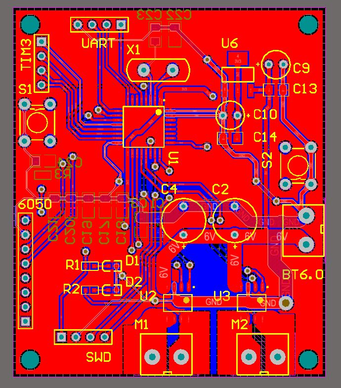 首先,电机供电线GND没有开关电路,在6V电源未供电时,调试时会直接使用3.3V线路驱动,造成我的STLink一直处于峰值电流状态,这显然是不太好的,需要更正。