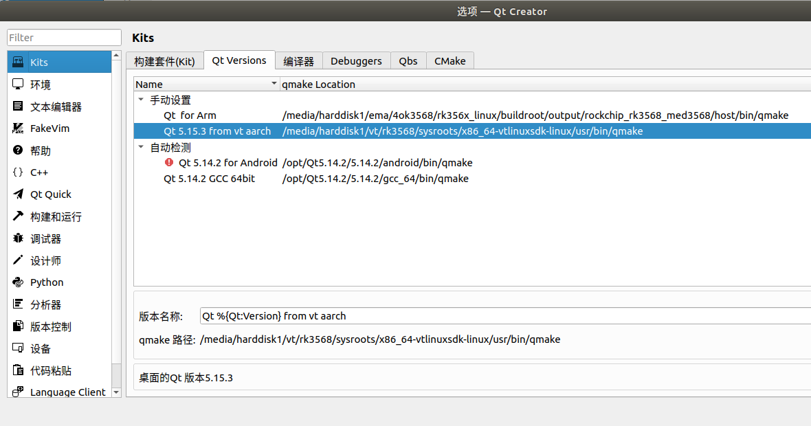 添加 - 版本名称:Qt %{Qt:Version} from vt aarch
