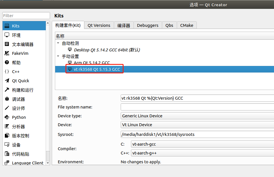 C++ - 新建:vt-aarch-g++,编译器路径:/media/harddisk1/vt/rk3568/sysroots/x86_64-vtlinuxsdk-linux/usr/bin/aarch64-vtlinux-linux/aarch64-vtlinux-linux-g++