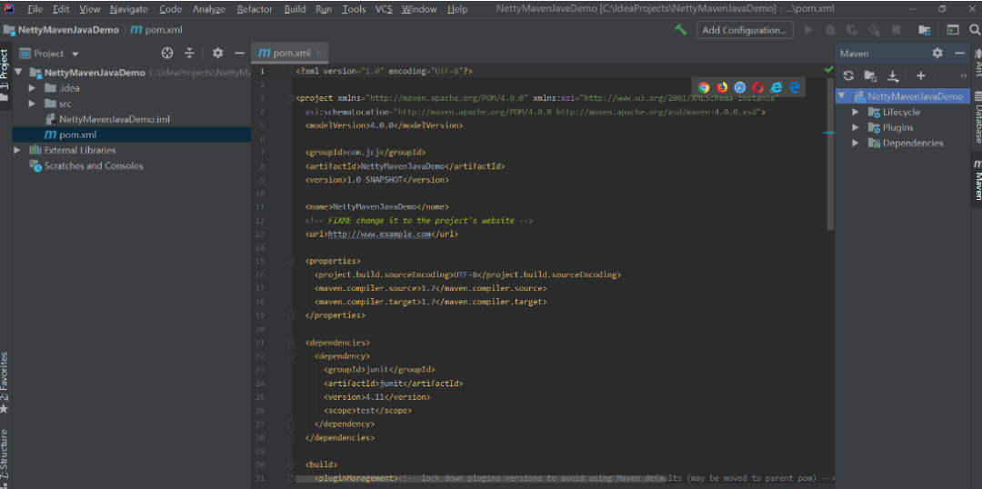 经过上面的步骤,我们的Maven工程就已经创建完毕,现在可以编写Netty的第一个程序,这个程序很简单,传输一个字符串,虽然程序很简单,但是已经能够大体上反映Netty开发通信程序的一个整体流程了。