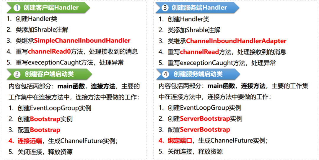 Netty开发的实际过程,这是一个简化的过程,但已经把大概流程表达出来了,绿色的代表客户端流程、蓝色的代表服务器端流程,注意标红的部分,见下图: