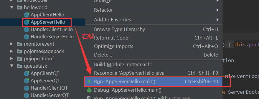 到这里,我们就把服务器端和客户端都写完了 ,如何运行呢,先在服务器端启动类上右键,点Run 'AppServerHello.main()'菜单运行,见下图: