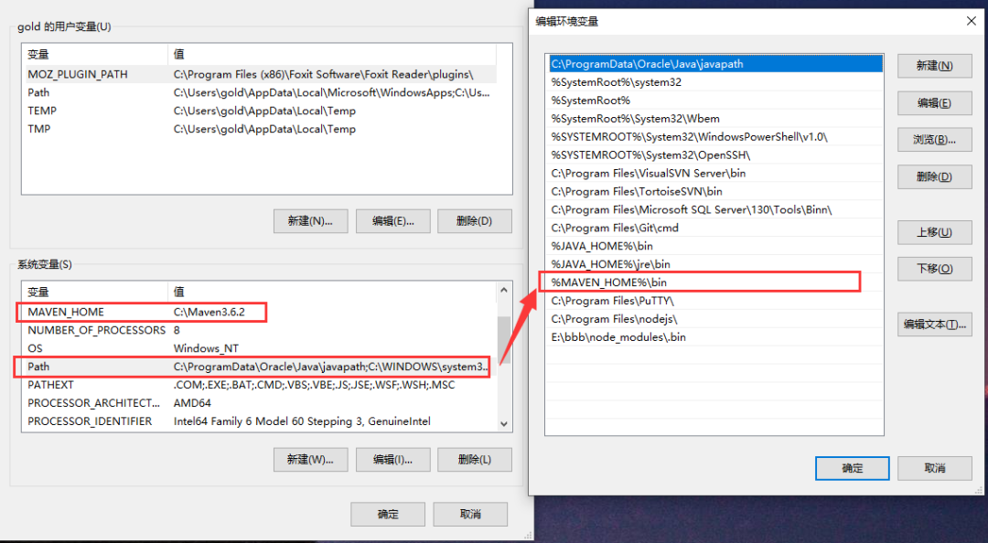 配置环境变量,和Java的环境变量配置一样的,创建MAVEN_HOME,指向Maven文件夹,再在path中添加进去就行,如下图: