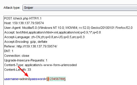 2、然后用admin和任意密码登录,并用burpsuite抓包,将抓到的包发送到intruder: