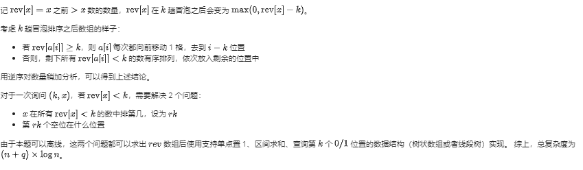 多次询问求经过 \(k\) 轮冒泡排序后 \(x\) 的位置,可以离线扫描线,只需要维护一个支持查询第 \(k\) 大的数据结构,用途是找有多少个数翻过了某一个点。