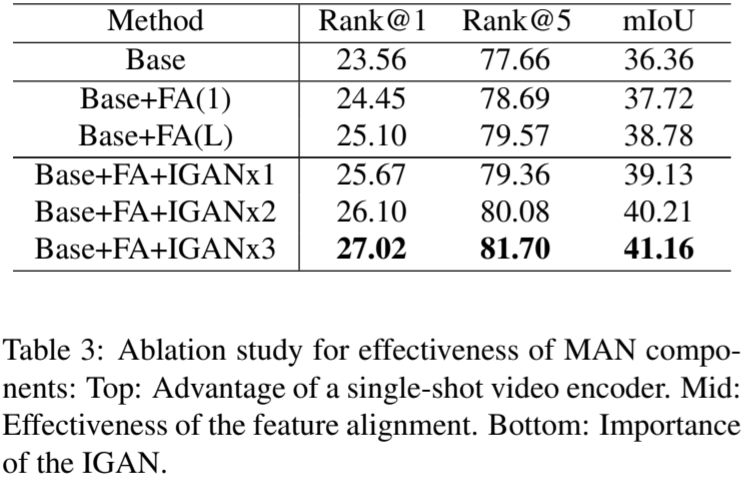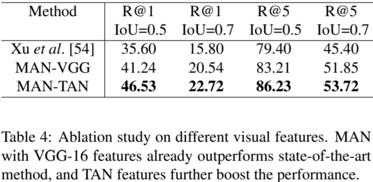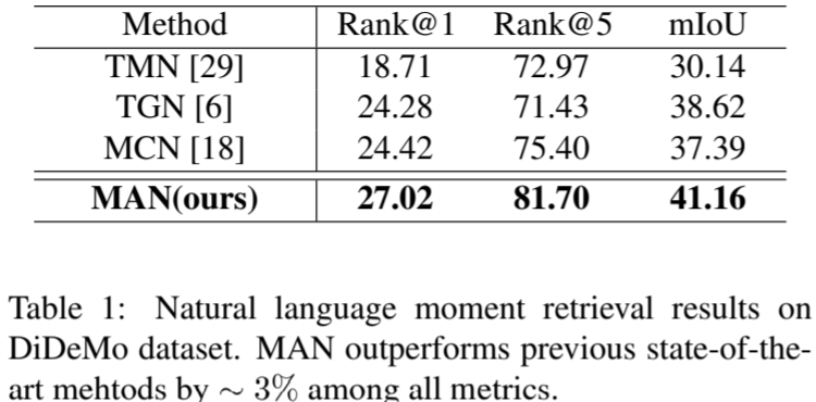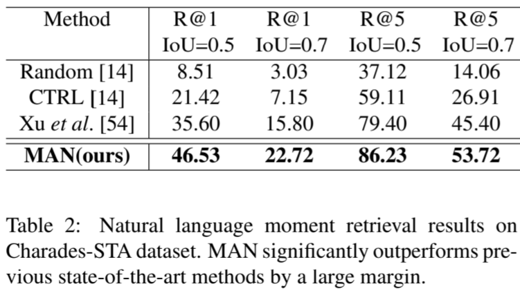 MAN: unifies the candidate moment encoding and temporal structural reasoning in a single-shot feed-forward network where language description is naturally integrated as a dynamic filters