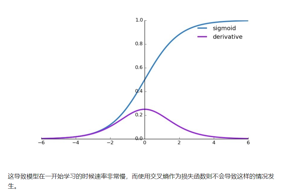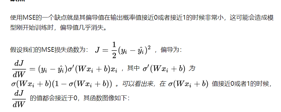我们发现,MSE能够判断出来模型2优于模型1,那为什么不采样这种损失函数呢? 主要原因是在分类问题中,使用sigmoid/softmx得到概率,配合MSE损失函数时,采用梯度下降法进行学习时,会出现模型一开始训练时,学习速率非常慢的情况 使用MSE的一个缺点就是其偏导值在输出概率值接近0或者接近1的时候非常小,这可能会造成模型刚开始训练时,偏导值几乎消失。