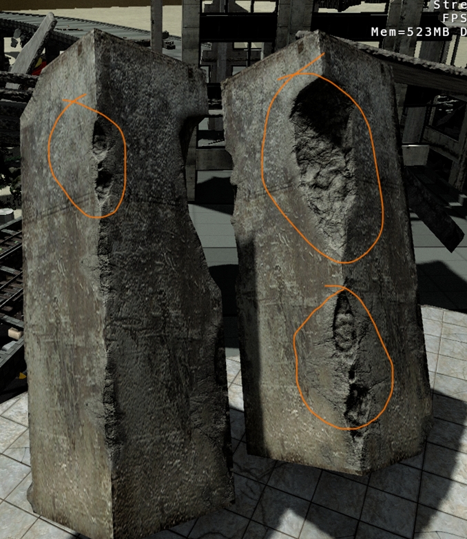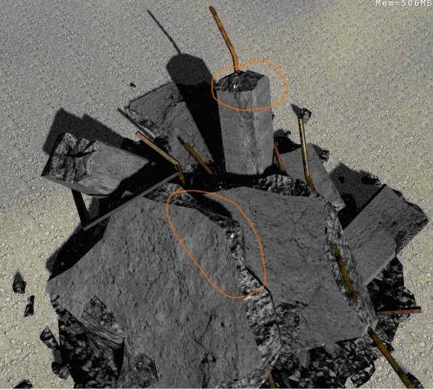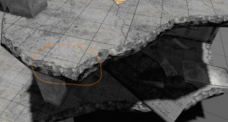 在大多数游戏中毁坏的城墙和其他破损的建筑结构是由简单的集合形状构成的截面,并在截面上铺上破损的纹理来表现。