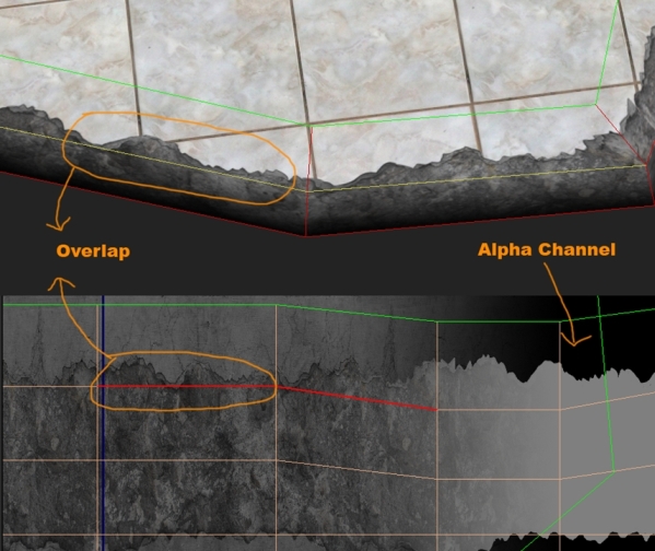 虽然这样性能高效并且简单,但这个方法的去点是,你用的两种材质之间的边界非常明显并且有分离裂痕。一个有效的方法是使用Alpha-Blending与Decals的来避免接缝,并提高视觉质量。
