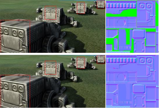 理想情况下,不需要在GPU下通过BumpMap的去实现NormalMap。即使是最小的细节也可以通过几何建模获得。然而,目前性能,显存和细节的三角形数仍然是一个大问题。NormalMap不用修改表面。他们只会影响Shading.使光照和阴影动态的结合。NormalMap可以存储为不同功能层次(如10厘米..0.1毫米),但它会工作的更好在细节比3D模型更小的时候。NormalMaps可以像其他纹理一样做MipMap操作,如果色彩平均的话不正确的表面细节可以被忽略。例如一个NormalMap的像素点和临近的上一个点和下一个点在下一个层级的MipMap中合并成一个平滑的像素点。好的美术人员可以通过避免高频率细节来减少这种效果。使用一些例如Noise或纹理的细节度的细节也可以帮助隐藏压缩但来的影响获得高质量的压缩效果。NormalMap的效果在高光或反射下的影响下是最明显的。任何一些小的不同都会被放大。