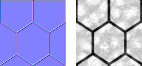 这个切线参考空间下的NormalMap的数据代表了一个被45度角截断的金字塔形状。并且有一个与他同类型的更小的金字塔形状在它上边。这个纹理可以被分配给纹理的BumpMap贴图通道。随着Tiling(使用DiffuseMap下的 Tiling)的使用它很容易检查到问题。