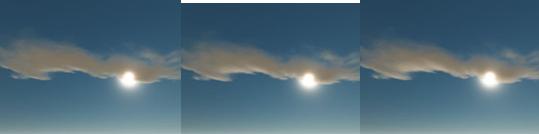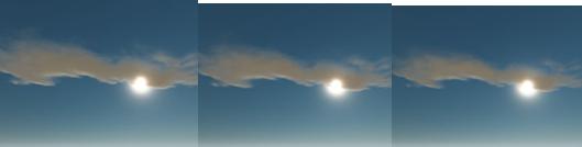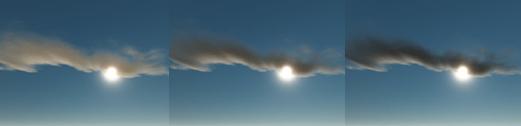 Attenuation: 控制当太阳光透过距离云的光强衰减。光衰减需要计算每个像素。它用于目前太阳色与天空色之间的混合。越高的衰减值云的子阴影越重。[0.0,5.0]