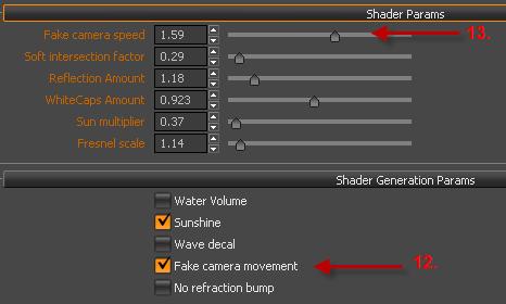 12). 开启Fake camera movement选项的话,这用于创建海洋表面的逆动画来获取摄像机随水面移动。因为水面上的动画对象模拟(包括角色)对于物理计算实在太昂贵了。