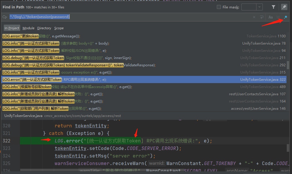 该正则可以同时匹配log.和token或者session或者password同时出现的代码