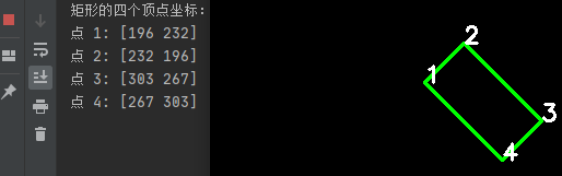 使用rect=cv2.minAreaRect(points)得到最小外接矩形的中心点坐标,宽,高,旋转角度外,常常需要获取这个最小外接矩形的四个顶点的坐标,需要使用box = cv2.boxPoints(rect)获取,然后使用box = np.int0(box)或box =np.int_(box)进一步将坐标转换成整数。这里先说结论,如果矩形没有倾斜的角度,那么得到的box的四个点坐标顺序为左上,右上,右下,左下;如果有倾斜角(0,90),则第一个至第四个点顺序为左(xmin),上(ymin),右(xmax),下(ymax);具体看下面程序与示意图: