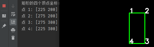 import cv2 import numpy as np image = np.zeros((500, 500, 3), dtype=np.uint8) # 定义矩形的中心点、宽度、高度和旋转角度 center = (250, 250) # 中心点坐标 width = 100 height = 50 angle = 45 # 旋转角度,单位为度 rect = ((center[0], center[1]), (width, height), angle) box = cv2.boxPoints(rect) # 计算旋转矩形的四个顶点 box = np.int0(box) # 将顶点坐标转换为整数 for i, point in enumerate(box): print(f"点 {i + 1}: {point}") # 打印矩形的四个顶点坐标 print("矩形的四个顶点坐标:") cv2.drawContours(image, [box], 0, (0, 255, 0), 2)