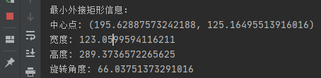 输出:包含三个元素的元组((cx, cy), (width, height), angle),其中cx,cy,width, height,angle均为float类型,分别代表中最小外接矩形的心点坐标,宽,高,旋转角度。