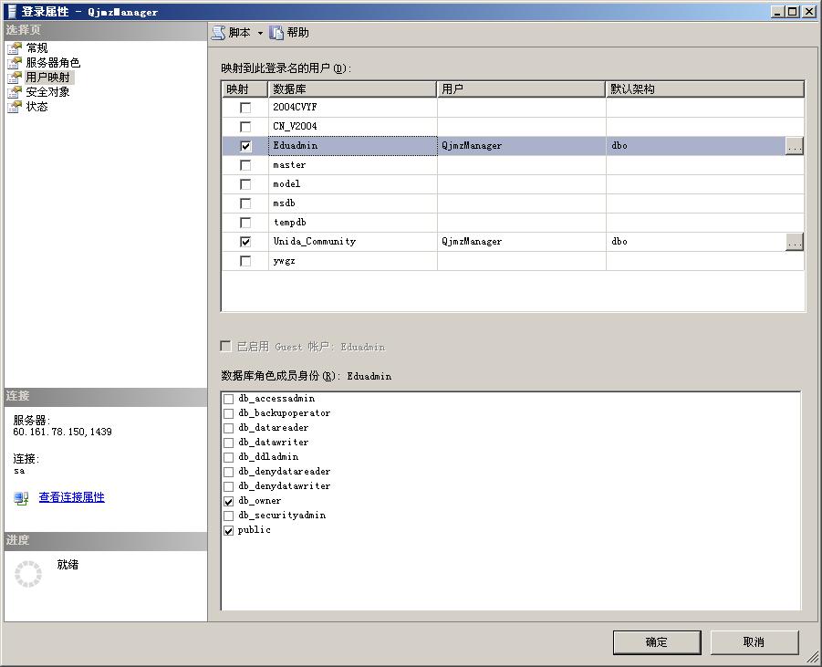 三、访问数据库的用户,其服务器角色不用设置,全为空,只需要设数据库映射即可,然后数据库映射映射只给db_ower、pubilc权限