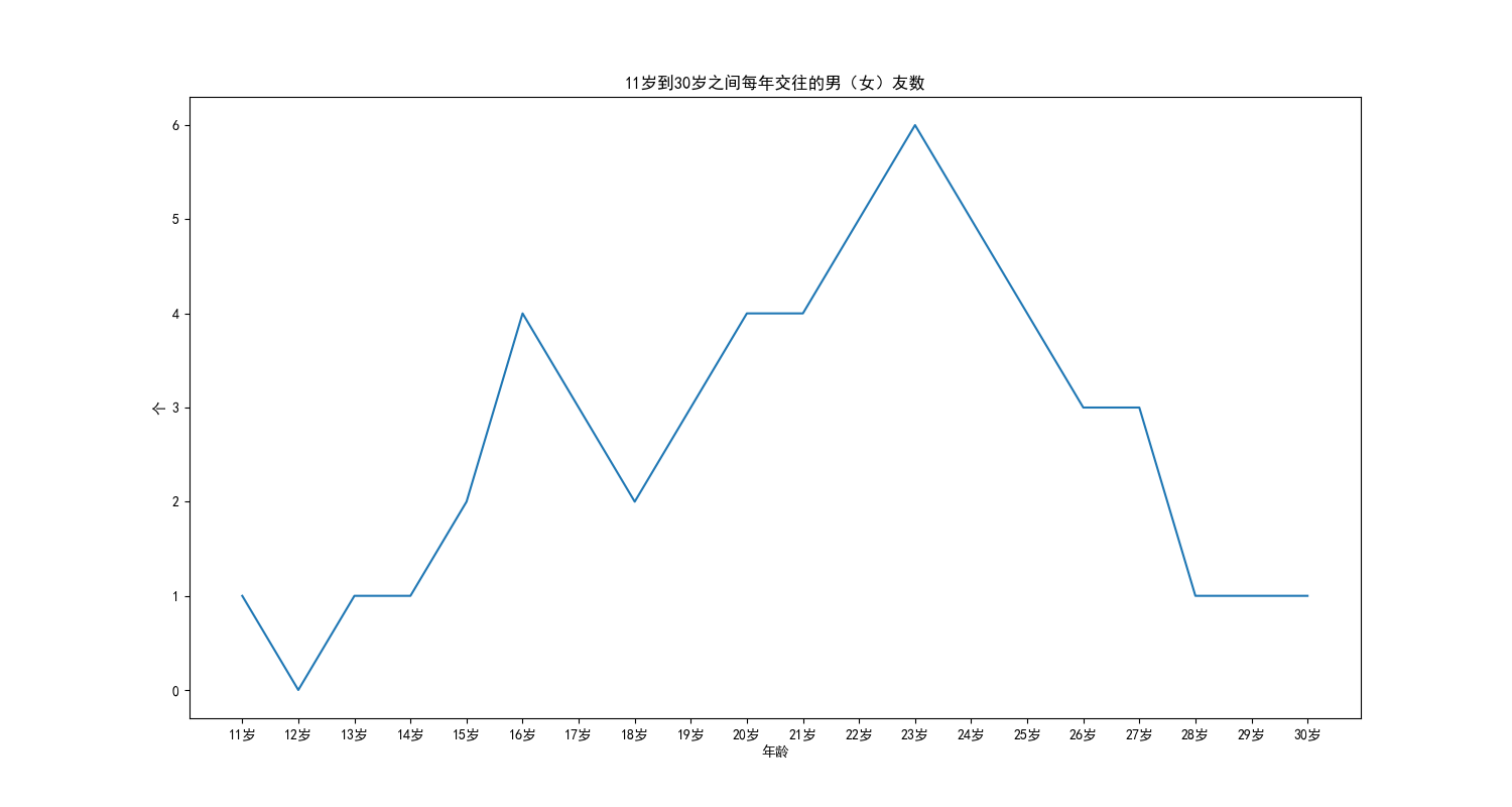 - 假设大家在30岁的时候,根据自己的实际情况,统计出来了从11岁到30岁每年交的女(男)朋友的数量如列表a,请绘制出该数据的折线图,以便分析自己每年交女(男)朋友的数量走势