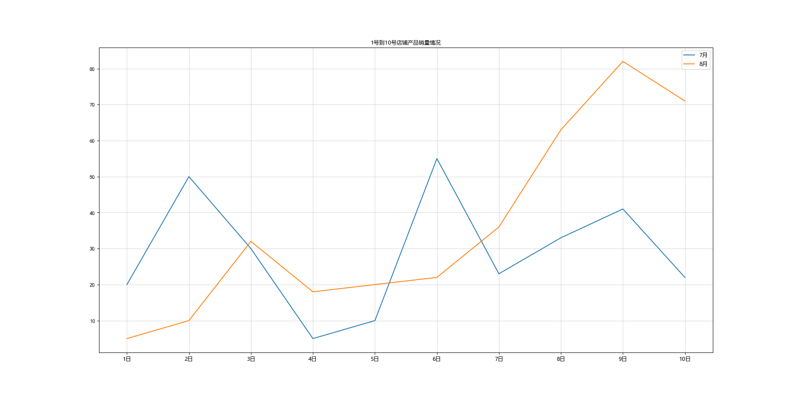 1 from matplotlib import pyplot as plt 2 from matplotlib import font_manager 3 4 # 解决中文乱码 5 plt.rcParams['font.sans-serif'] = ['SimHei'] 6 plt.rcParams['font.serif'] = ['SimHei'] 7 8 # 设置字体 9 my_font = font_manager.FontProperties(fname="C:\Windows\Fonts\msyh.ttc") 10 11 # 设置画布大小 12 plt.figure(figsize=(20, 10), dpi=80) 13 14 x = range(1, 11) 15 y_1 = [20, 50, 30, 5, 10, 55, 23, 33, 41, 22] 16 y_2 = [5, 10, 32, 18, 20, 22, 36, 63, 82, 71] 17 18 plt.plot(x, y_1, label="7月") 19 plt.plot(x, y_2, label="8月") 20 _x = x 21 _xtick_labels = ["{}日".format(i) for i in _x] 22 plt.xticks(x, _xtick_labels, fontproperties=my_font) 23 24 plt.title("1号到10号店铺产品销量情况", fontproperties=my_font) 25 26 plt.legend(prop=my_font, loc="best") 27 28 # 绘制网格 29 plt.grid(alpha=0.5) 30 31 plt.show()
