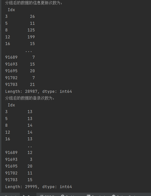 #导入模块 import pandas as pd import numpy as np LogInfo = pd.read_csv('D:/Users/lenovo/Desktop/期中/Training_LogInfo.csv',encoding='gbk') Userupdate = pd.read_csv('D:/Users/lenovo/Desktop/期中/Training_Userupdate.csv',encoding='gbk') # 使用groupby方法对用户信息更新表和登录信息表进行分组 LogGroup = LogInfo[['Idx','LogInfo3']].groupby(by = 'Idx') UserGroup = Userupdate[['Idx','UserupdateInfo2']].groupby(by = 'Idx') # 使用agg方法求取分组后的最早,最晚,更新登录时间 print('分组后的最早登录时间为:\n',LogGroup.agg(np.min)) print('分组后的最晚登录时间为:\n',LogGroup.agg(np.max)) print('分组后的最早更新时间为:\n',UserGroup.agg(np.min)) print('分组后的最晚更新时间为:\n',UserGroup.agg(np.max)) # 使用size方法求取分组后的数据的信息更新次数与登录次数 print('分组后的数据的信息更新次数为:\n',LogGroup.size()) print('分组后的数据的登录次数为:\n',UserGroup.size())