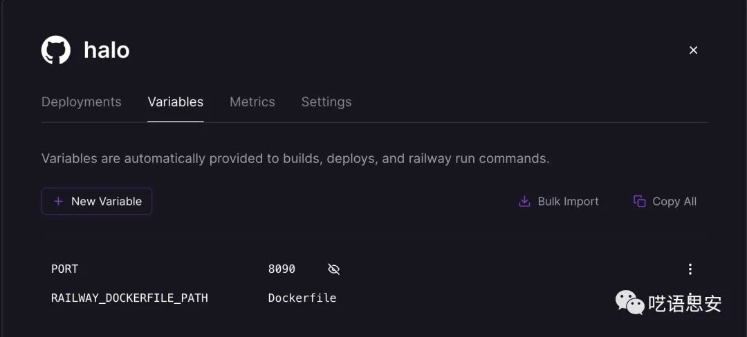设置环境变量:打开项目在Variables中设置两个环境变量,一个是Dockerfile的路径,一个是访问的端口,因为halo中的Dockerfile是放在根目录的,因此这里直接写Dockerfile就好了,PORT必须是8090,因为halo中的镜像已经指定了端口