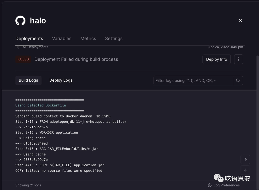 设置好后,RailWay会自动进行部署,你会发现又出现部署失败了,通过查看日志发现,是Dockerfile中需要获取build/libs下面的jar文件,因为官方说支持java直接部署,其实也是直接部署的jar包,所以这里lib下的其实也就是要部署的那个jar包;「通过查看Halo的项目源码,发现项目中将build文件夹加了gitignore,所以这里肯定找不到,我的解决方案是在仓库中下载了最新的jar包,并将其放在了build/libs文件夹下面,再将这个jar文件提交到github上面,就可以部署成功了」
