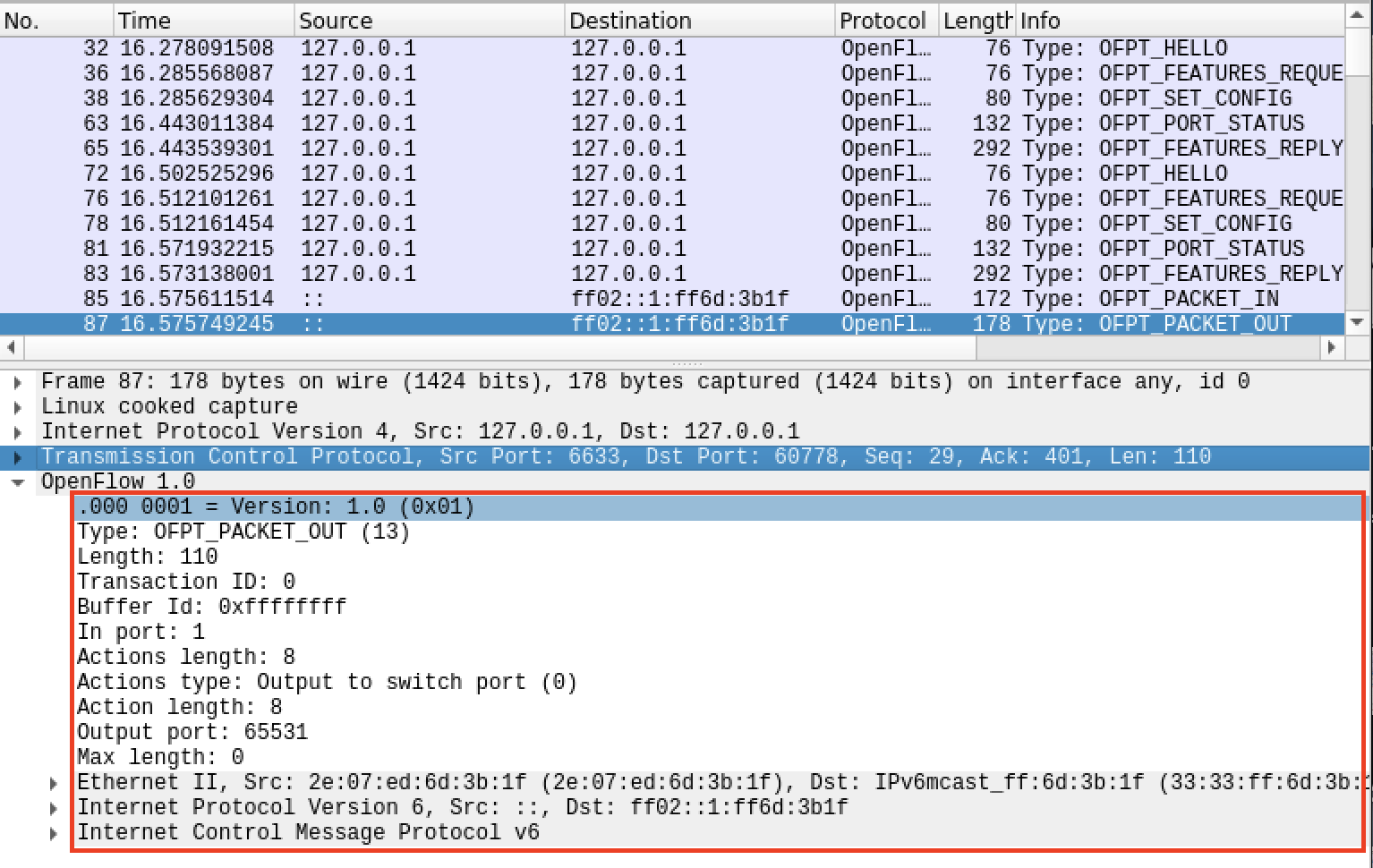分析抓取的flow_mod数据包,控制器通过6633端口向交换机60778端口、交换机60780端口下发流表项,指导数据的转发处理