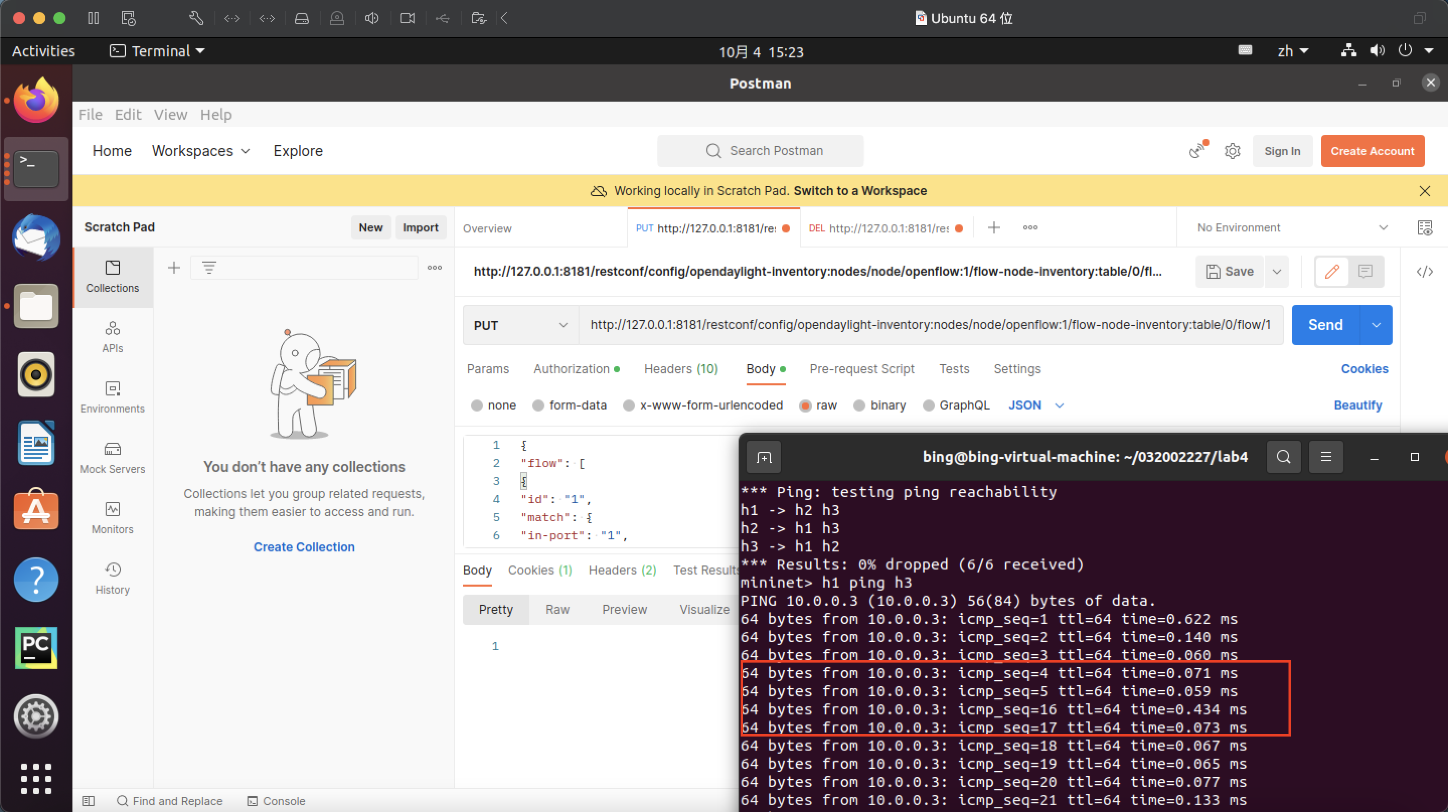 - 没有先在Mininet CLI中运行h1 ping h3,再在Postman处选择动作PUT,导致无法得到实验结果(后来发现了)。