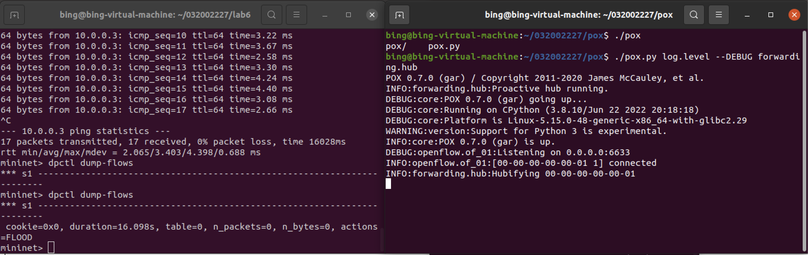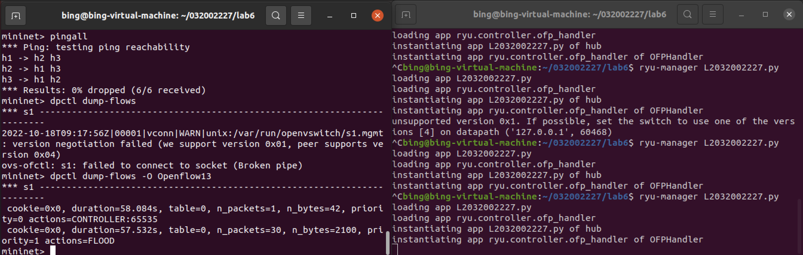 Ryu的L2Switch模块和POX的Hub模块都采用洪泛转发的方式,但不同之处在于:可以在pox的Hub模块运行时查看流表,而无法在ryu的L2Switch模块运行时查看到流表(如图)。