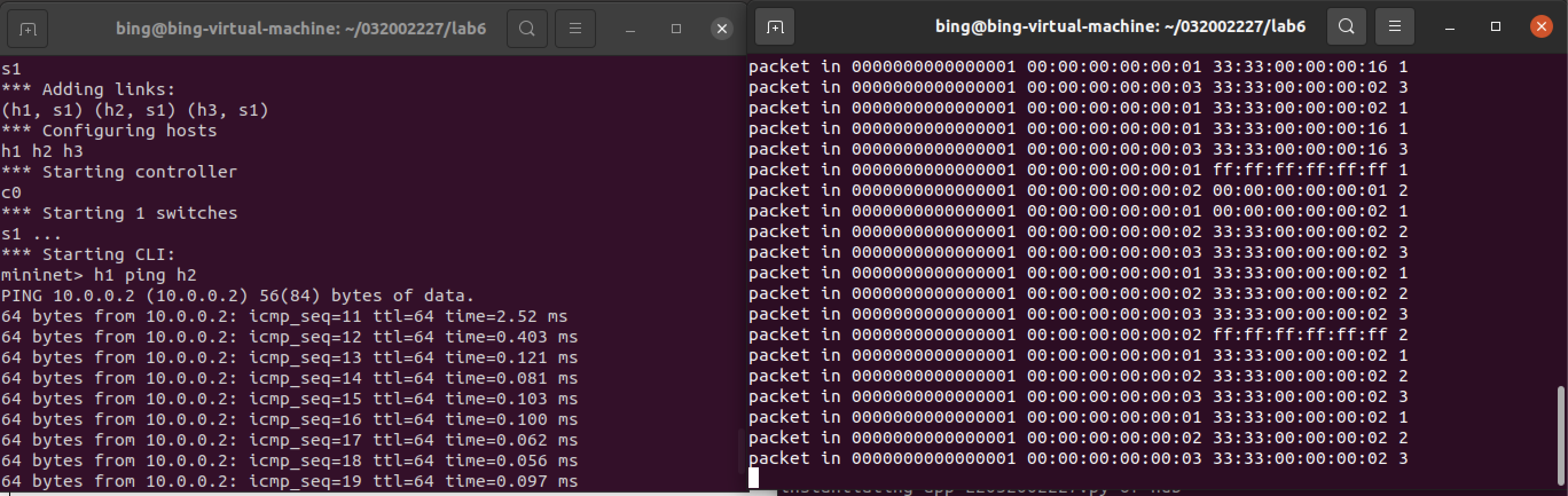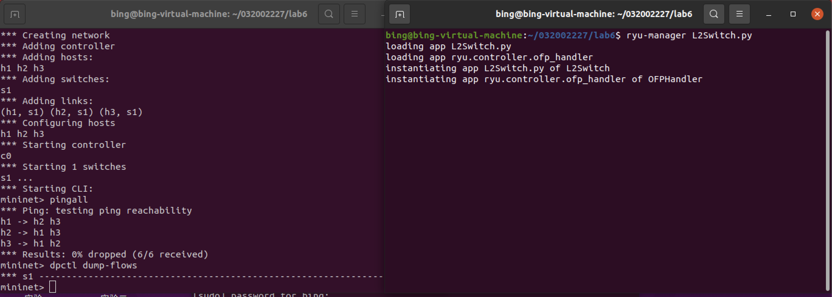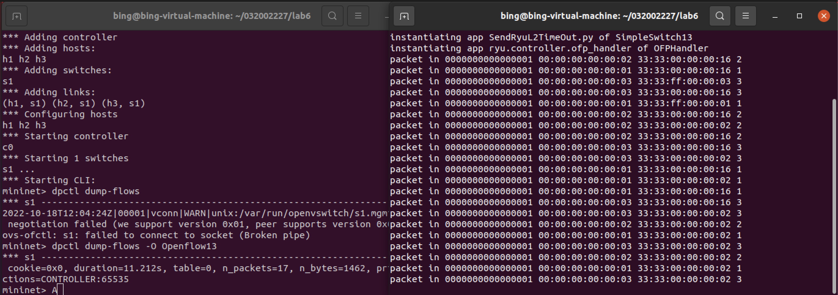 ryu-manager L2Switch.py运行 ryu,再建立拓扑。 - 困难:修改模块的时候发现程序运行错误。