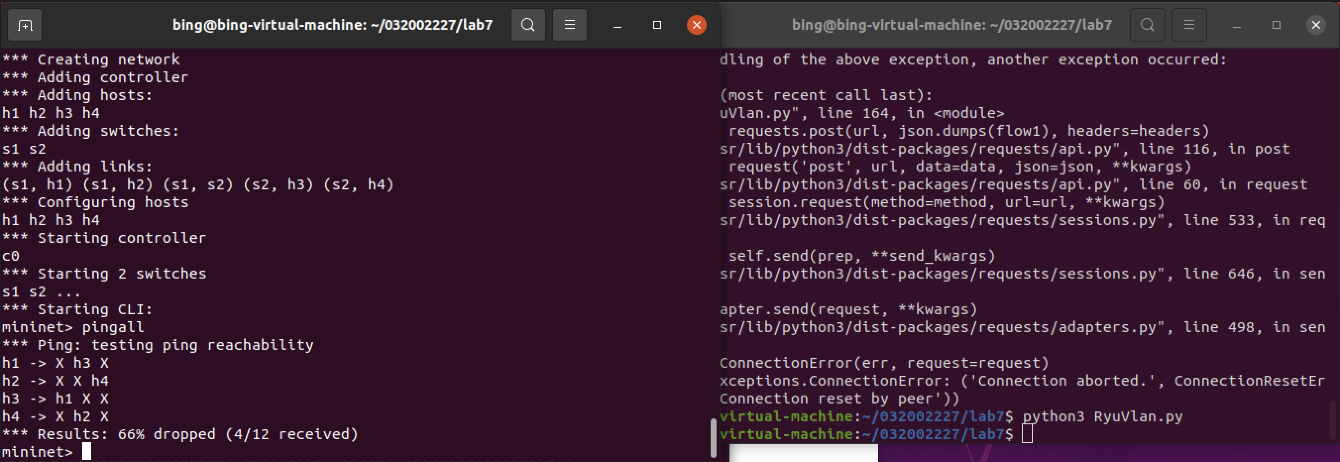 RyuVlan.py#Topo.py:建立要求的拓扑 from mininet.topo import Topo class MyTopo(Topo): def __init__(self): # initilaize topology Topo.__init__(self) self.addSwitch("s1") self.addSwitch("s2") self.addHost("h1") self.addHost("h2") self.addHost("h3") self.addHost("h4") self.addLink("s1", "h1") self.addLink("s1", "h2") self.addLink("s2", "h3") self.addLink("s2", "h4") self.addLink("s1", "s2") topos = {'mytopo': (lambda: MyTopo())}import json import requests if __name__ == "__main__": url = 'http://127.0.0.1:8080/stats/flowentry/add' headers = {'Content-Type': 'application/json'} flow1 = { "dpid": 1, "priority": 1, "match":{ "in_port": 1 }, "actions":[ { "type": "PUSH_VLAN", "ethertype": 33024 }, { "type": "SET_FIELD", "field": "vlan_vid", "value": 4096 }, { "type": "OUTPUT", "port": 3 } ] } flow2 = { "dpid": 1, "priority": 1, "match":{ "in_port": 2 }, "actions":[ { "type": "PUSH_VLAN", "ethertype": 33024 }, { "type": "SET_FIELD", "field": "vlan_vid", "value": 4097 }, { "type": "OUTPUT", "port": 3 } ] } flow3 = { "dpid": 1, "priority": 1, "match":{ "vlan_vid": 0 }, "actions":[ { "type": "POP_VLAN", "ethertype": 33024 }, { "type": "OUTPUT", "port": 1 } ] } flow4 = { "dpid": 1, "priority": 1, "match": { "vlan_vid": 1 }, "actions": [ { "type": "POP_VLAN", "ethertype": 33024 }, { "type": "OUTPUT", "port": 2 } ] } flow5 = { "dpid": 2, "priority": 1, "match": { "in_port": 1 }, "actions": [ { "type": "PUSH_VLAN", "ethertype": 33024 }, { "type": "SET_FIELD", "field": "vlan_vid", "value": 4096 }, { "type": "OUTPUT", "port": 3 } ] } flow6 = { "dpid": 2, "priority": 1, "match": { "in_port": 2 }, "actions": [ { "type": "PUSH_VLAN", "ethertype": 33024 }, { "type": "SET_FIELD", "field": "vlan_vid", "value": 4097 }, { "type": "OUTPUT", "port": 3 } ] } flow7 = { "dpid": 2, "priority": 1, "match": { "vlan_vid": 0 }, "actions": [ { "type": "POP_VLAN", "ethertype": 33024 }, { "type": "OUTPUT", "port": 1 } ] } flow8 = { "dpid": 2, "priority": 1, "match": { "vlan_vid": 1 }, "actions": [ { "type": "POP_VLAN", "ethertype": 33024 }, { "type": "OUTPUT", "port": 2 } ] } res1 = requests.post(url, json.dumps(flow1), headers=headers) res2 = requests.post(url, json.dumps(flow2), headers=headers) res3 = requests.post(url, json.dumps(flow3), headers=headers) res4 = requests.post(url, json.dumps(flow4), headers=headers) res5 = requests.post(url, json.dumps(flow5), headers=headers) res6 = requests.post(url, json.dumps(flow6), headers=headers) res7 = requests.post(url, json.dumps(flow7), headers=headers) res8 = requests.post(url, json.dumps(flow8), headers=headers)![]()