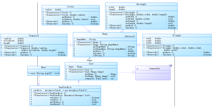 class DealCardList{ ArrayList<C> cardList =new ArrayList<>(); DealCardList(){} DealCardList(ArrayList<Integer> list){ for(Integer card:list){//便利list数组,将其存入card中 switch (card){//将图形存入cardlist case 1://圆形 double r = work7_1.Game.input.nextDouble(); C card1 = new C(new Circle(r)); card1.getShape().setType("Circle"); cardList.add(card1); break; case 2://矩形 double h = work7_1.Game.input.nextDouble(); double w = work7_1.Game.input.nextDouble(); C card2 = new C(new Rectangle(h,w)); card2.getShape().setType("Rectangle"); cardList.add(card2); break; case 3://三角形 double a = work7_1.Game.input.nextDouble(); double b = work7_1.Game.input.nextDouble(); double c = work7_1.Game.input.nextDouble(); C card3 = new C(new Triangle(a,b,c)); card3.getShape().setType("Triangle"); cardList.add(card3); break; case 4://梯形 double hl = work7_1.Game.input.nextDouble(); double dl = work7_1.Game.input.nextDouble(); double l = work7_1.Game.input.nextDouble(); C card4 = new C(new Trapezoid(hl,dl,l)); card4.getShape().setType("Trapezoid"); cardList.add(card4); break; } } } public boolean validate(){//有效性 for(C card:cardList){ if (!card.getShape().validate()){ return false; } } return true; } public void cardSort(){//做排序 TreeSet<C> cards = new TreeSet<>(cardList); for (C card : cards) { System.out.print(card.getShape()+":"); System.out.printf("%.2f ",card.getShape().getArea()); } } public double getAllArea(){ double sum = 0; for (C card : cardList){ sum+=card.getShape().getArea(); } return sum; } public void showResult(){ System.out.println("The original list:");//大家的面积 for (C card : cardList){ System.out.print(card.getShape()+":"); System.out.printf("%.2f ",card.getShape().getArea()); } System.out.println(); System.out.println("The sorted list:");//排序后的面积 cardSort(); System.out.println(); System.out.printf("Sum of area:%.2f",getAllArea());//要用printf才能使用%.2f } }