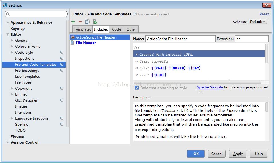 在右则的Includes中ActionScript File Header和File Header 把对应的用户名(user)改掉就可以。